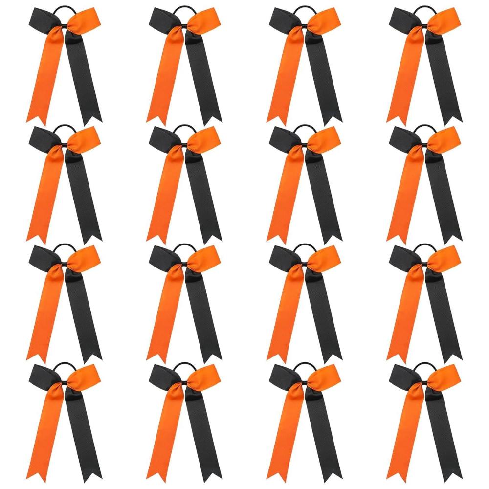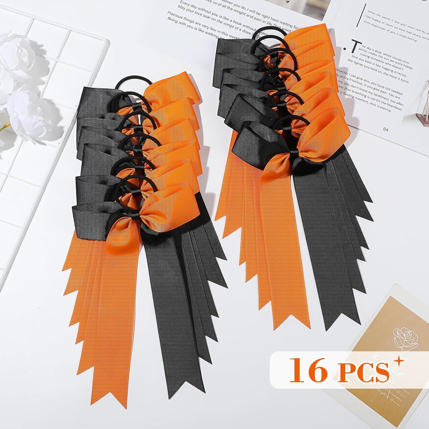 DEEKA 12 PCS Collegiate Style Cheer Bows Long Tail Skinny Ponytail Holder Handmade for Girls Teens Softball Cheerleader Sports -Red(Orange/Black)