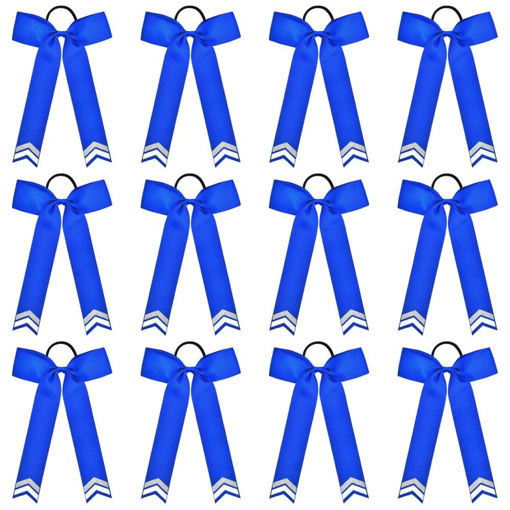 DEEKA 12PCS Collegiate Style Cheer Bows with Glitter Chevrons Tail Skinny College Cheerleader Ponytail Holder for Volleyball Softball Girls (Hunter Green/Black/White)(Royal Blue+Glitter Silver/White)