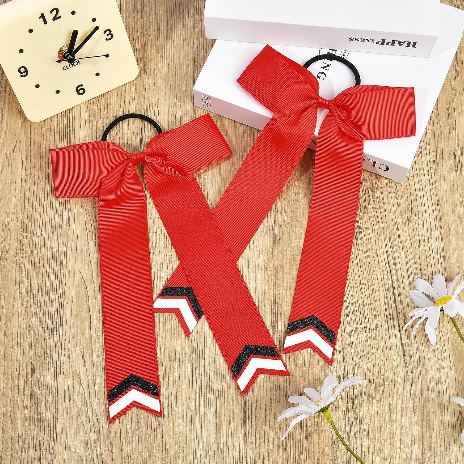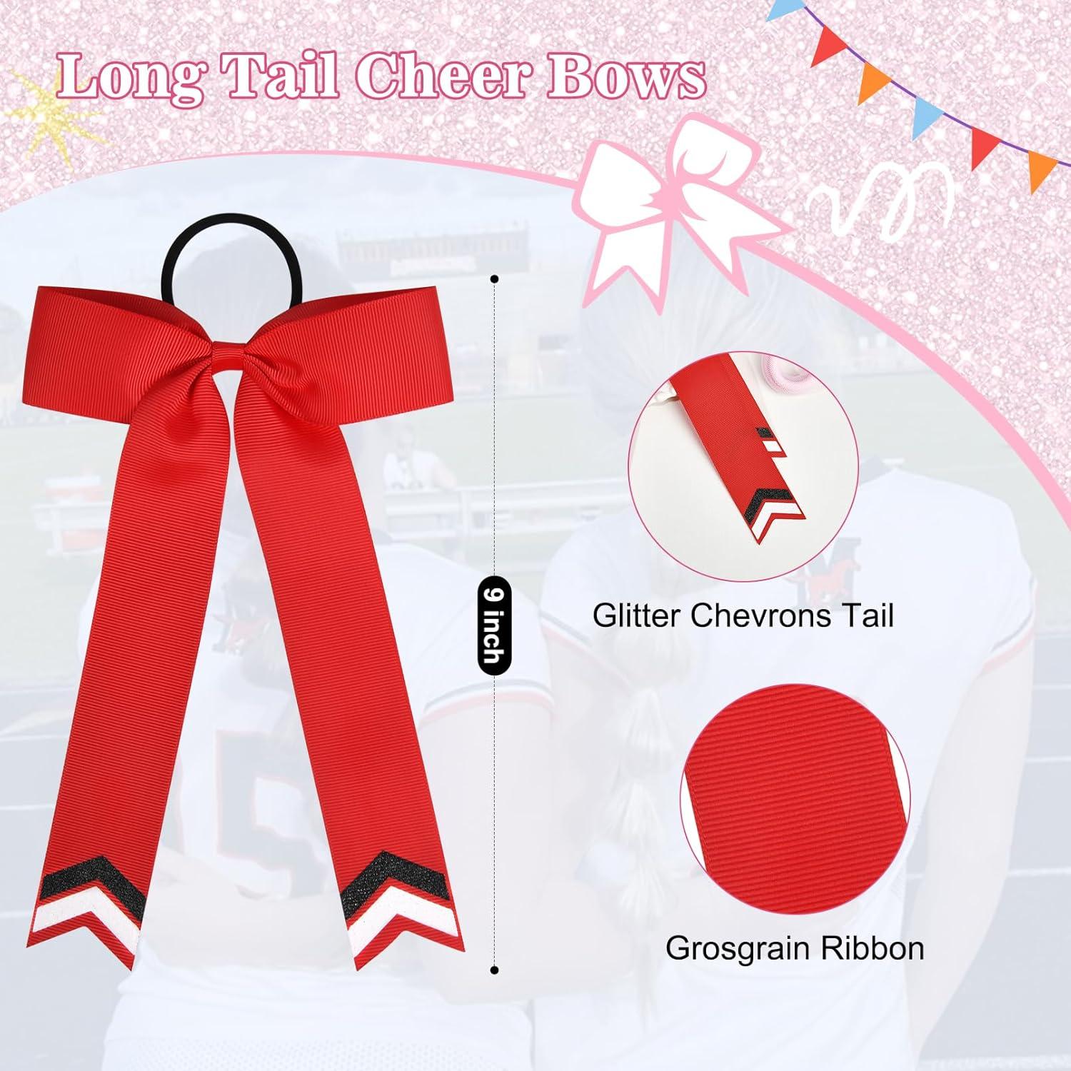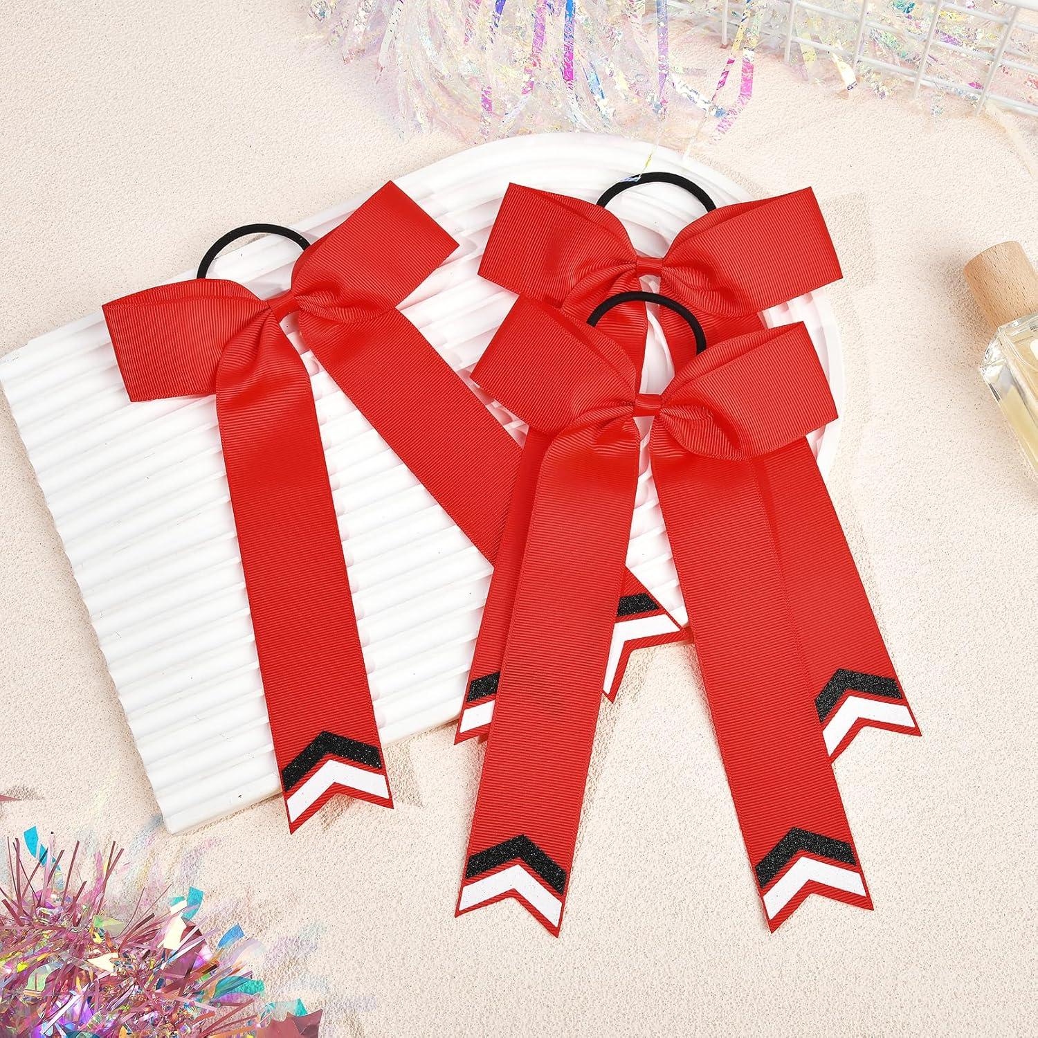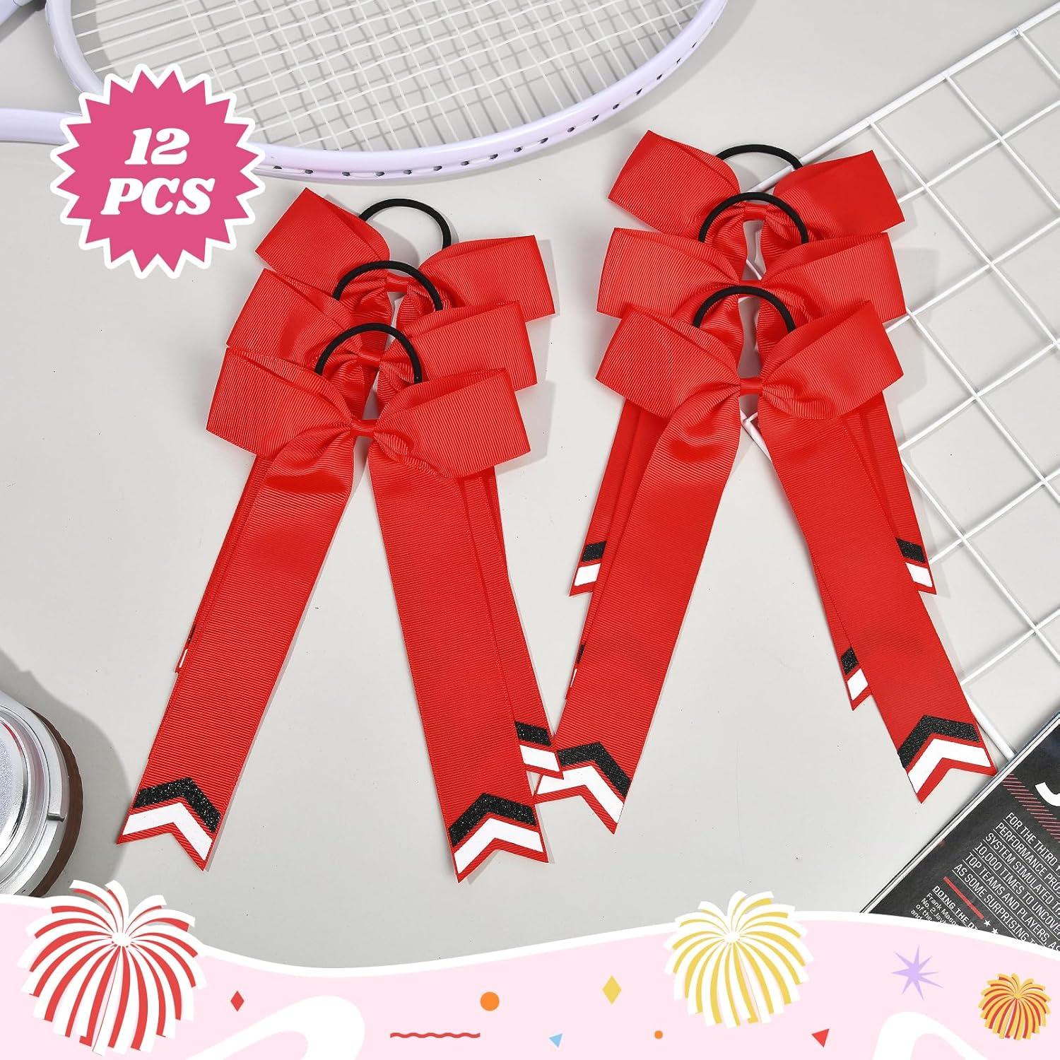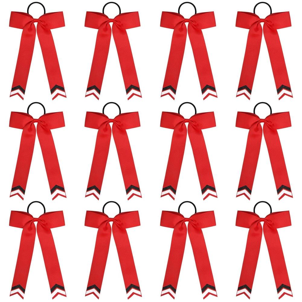 DEEKA 12PCS Collegiate Style Cheer Bows with Glitter Chevrons Tail Skinny College Cheerleader Ponytail Holder for Volleyball Softball Girls (Red/Black/White)