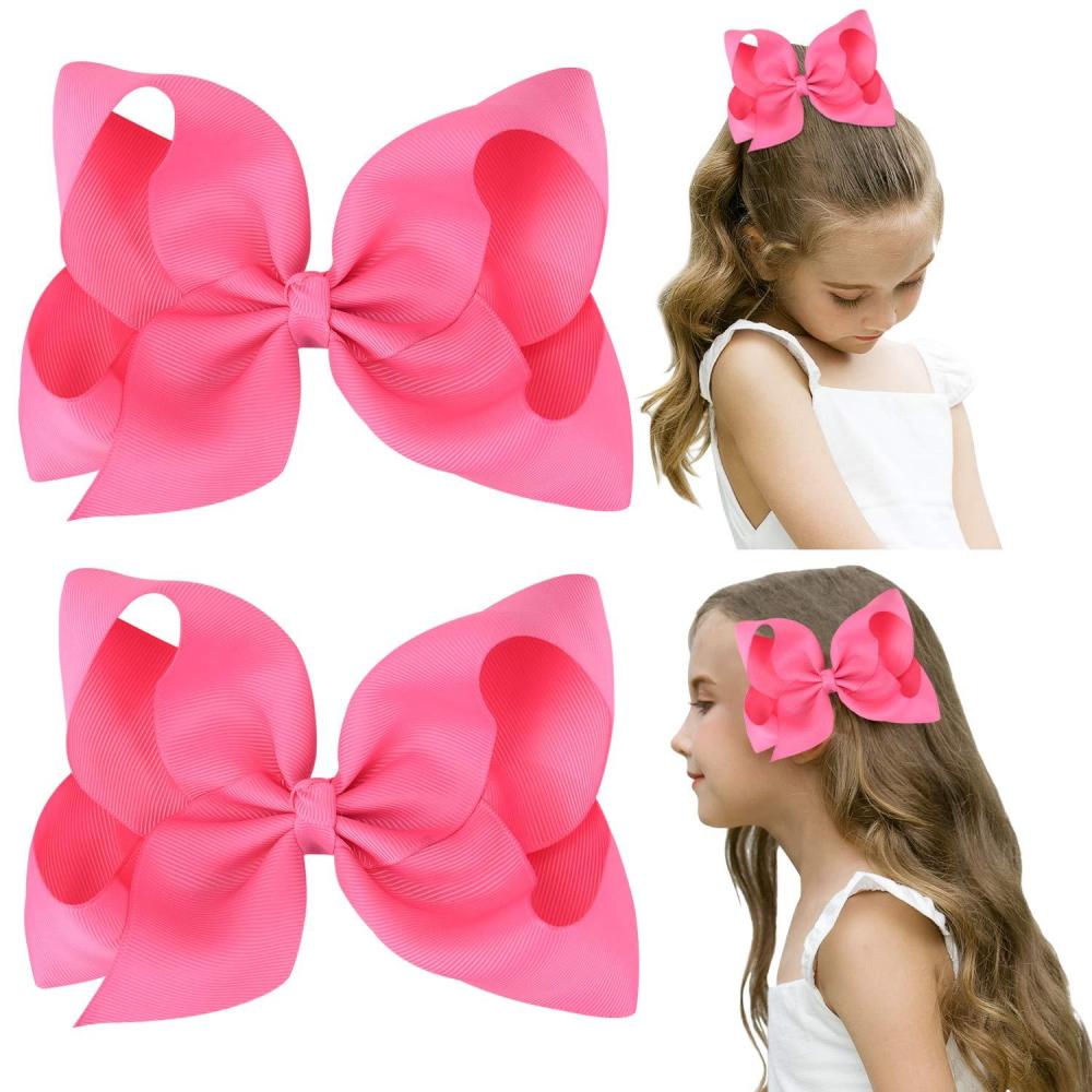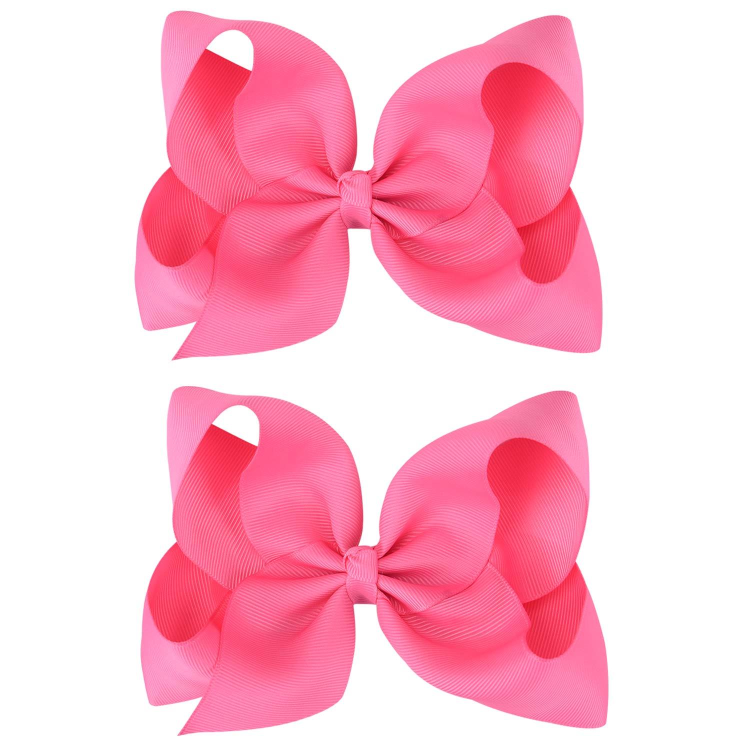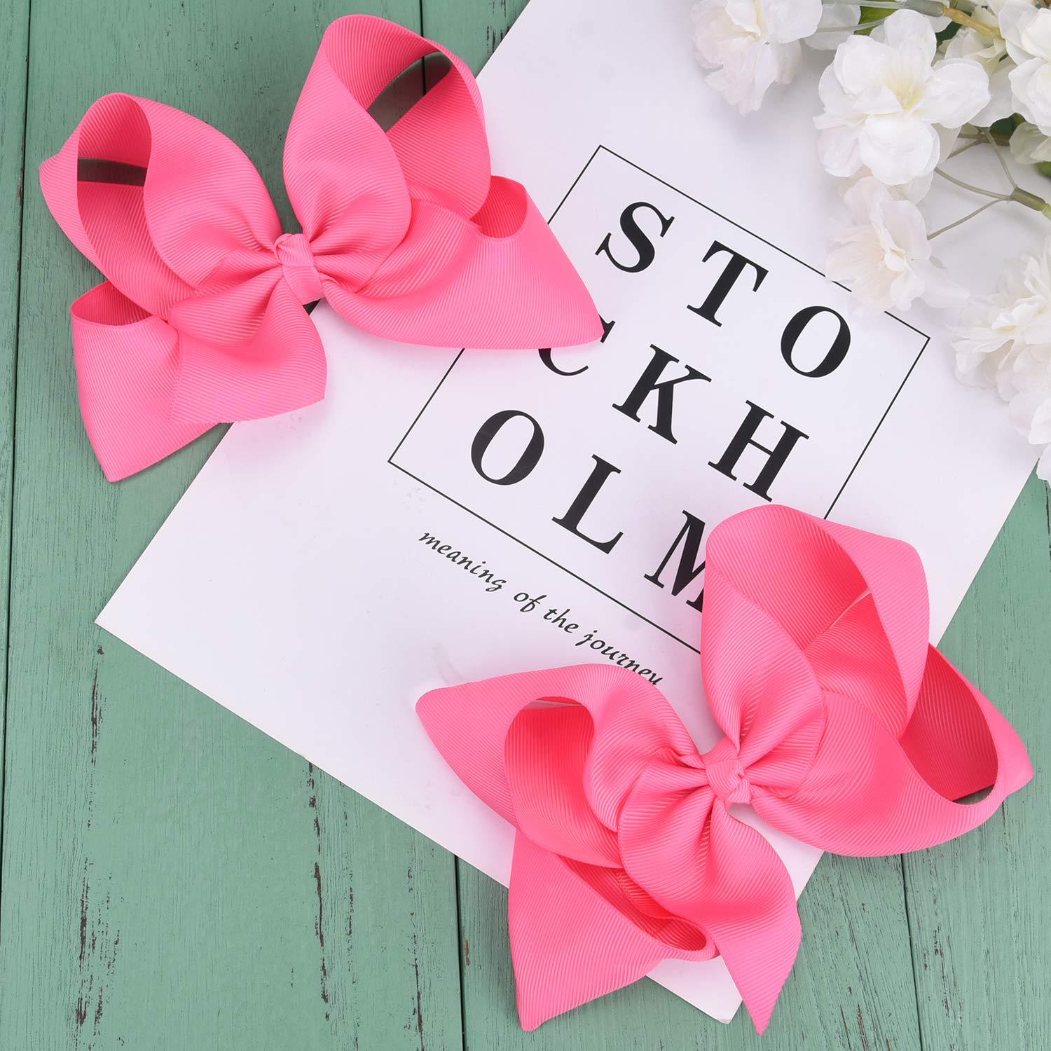 DEEKA 2 PCS 6" Big Hand-made Grosgrain Ribbon Solid Color Hair Bows Alligator Clips Hair Accessories for Little Teen Toddler Girls Kids Set of 2 -Red(Hot Pink)