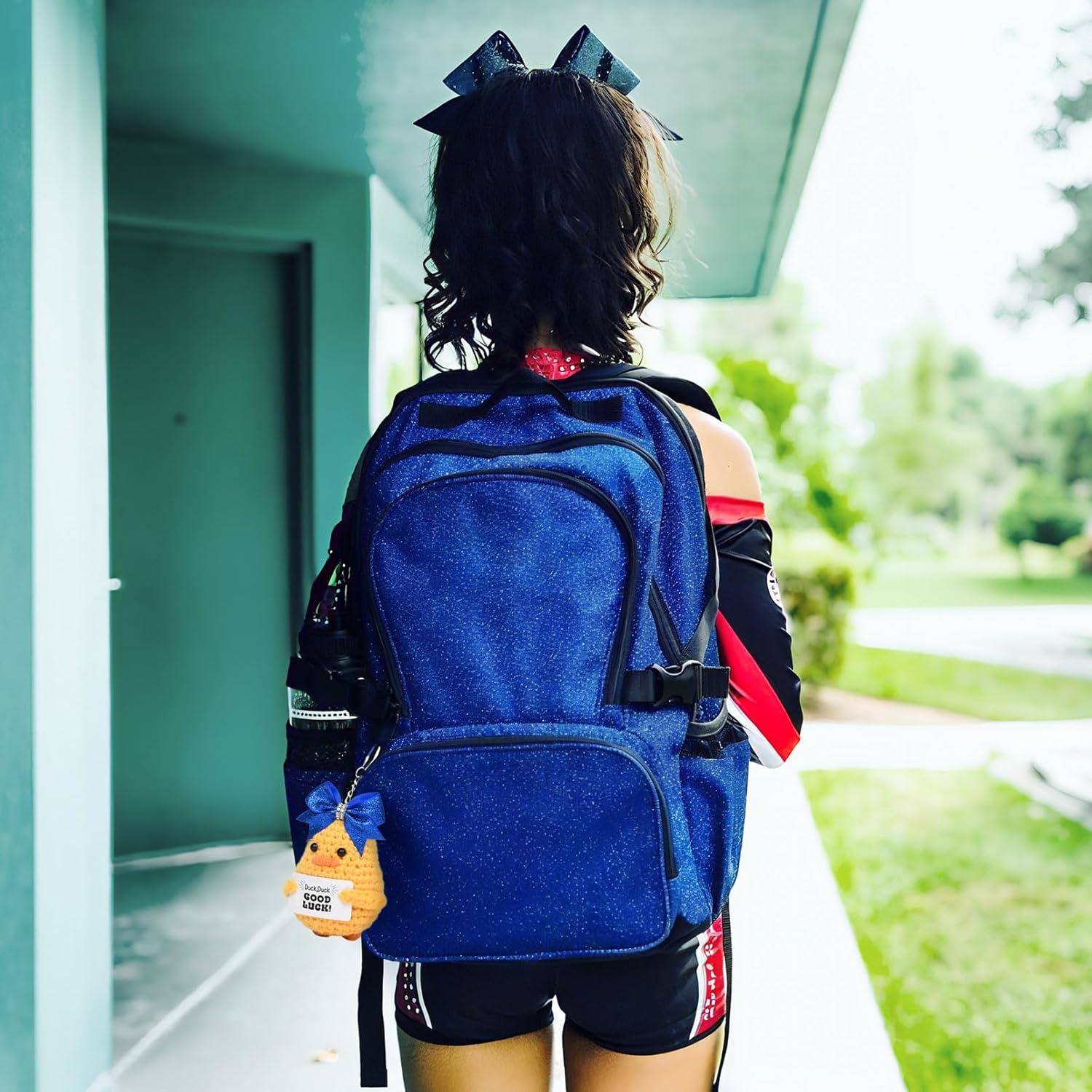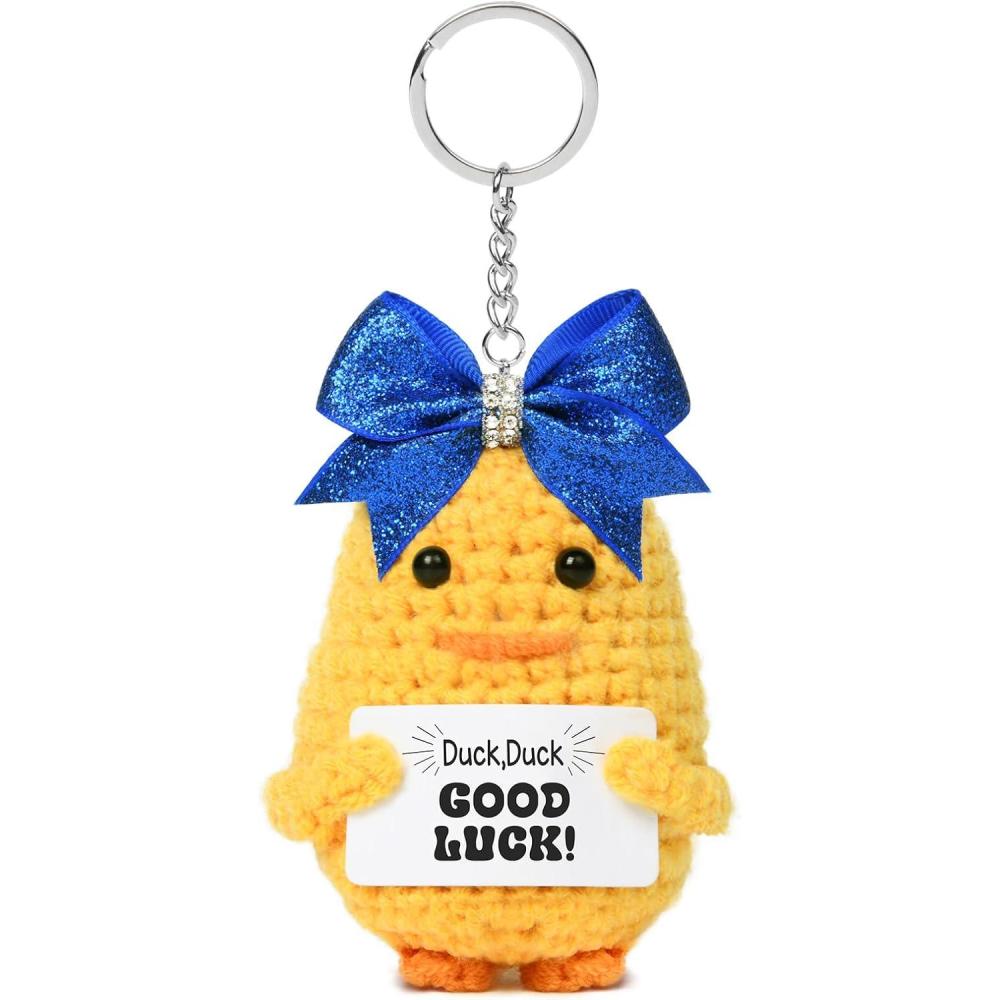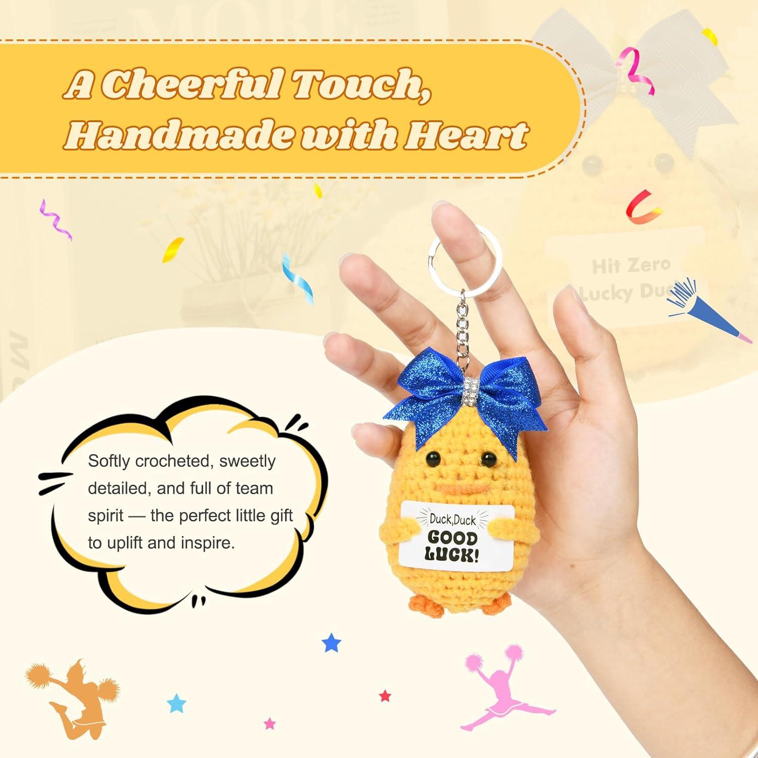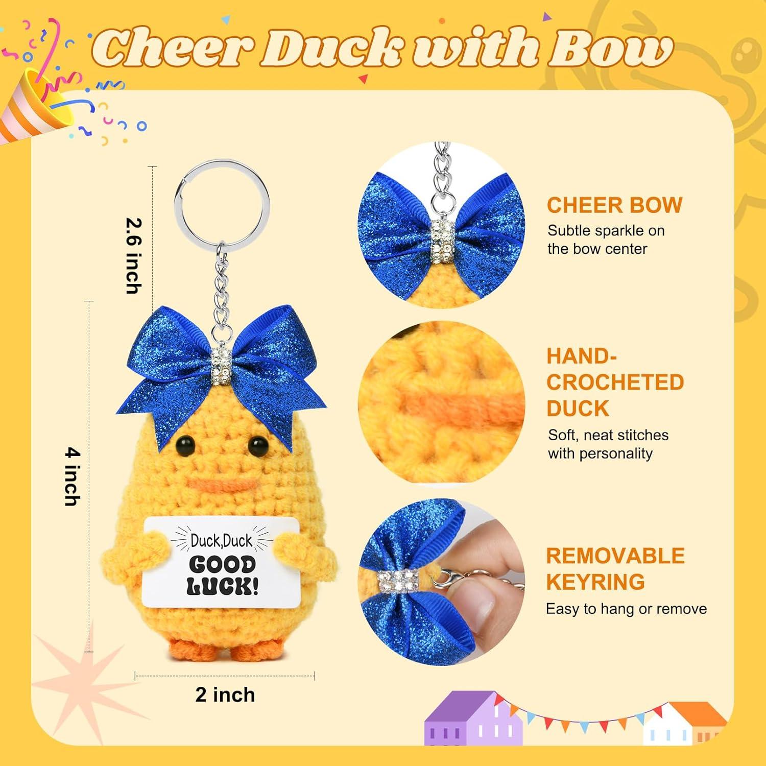 DEEKA Crochet Cheer Duck with Bow Cheer Gifts Bag Accessories Essentials Keychain for Backpack Cheerleading Team Gifts(Glitter Royal Blue Bow)