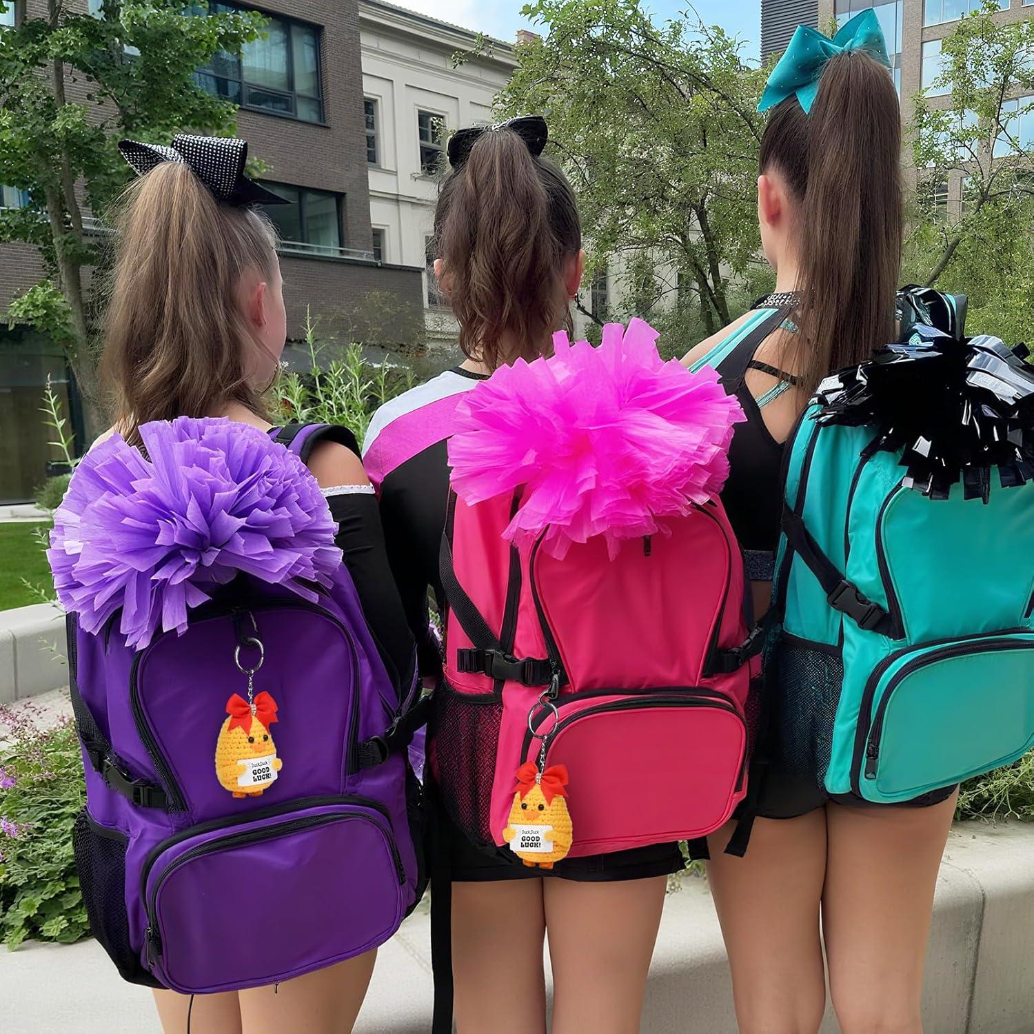 DEEKA Crochet Cheer Duck with Bow Cheer Gifts Bag Accessories Essentials Keychain for Backpack Cheerleading Team Gifts(Purple Bow)