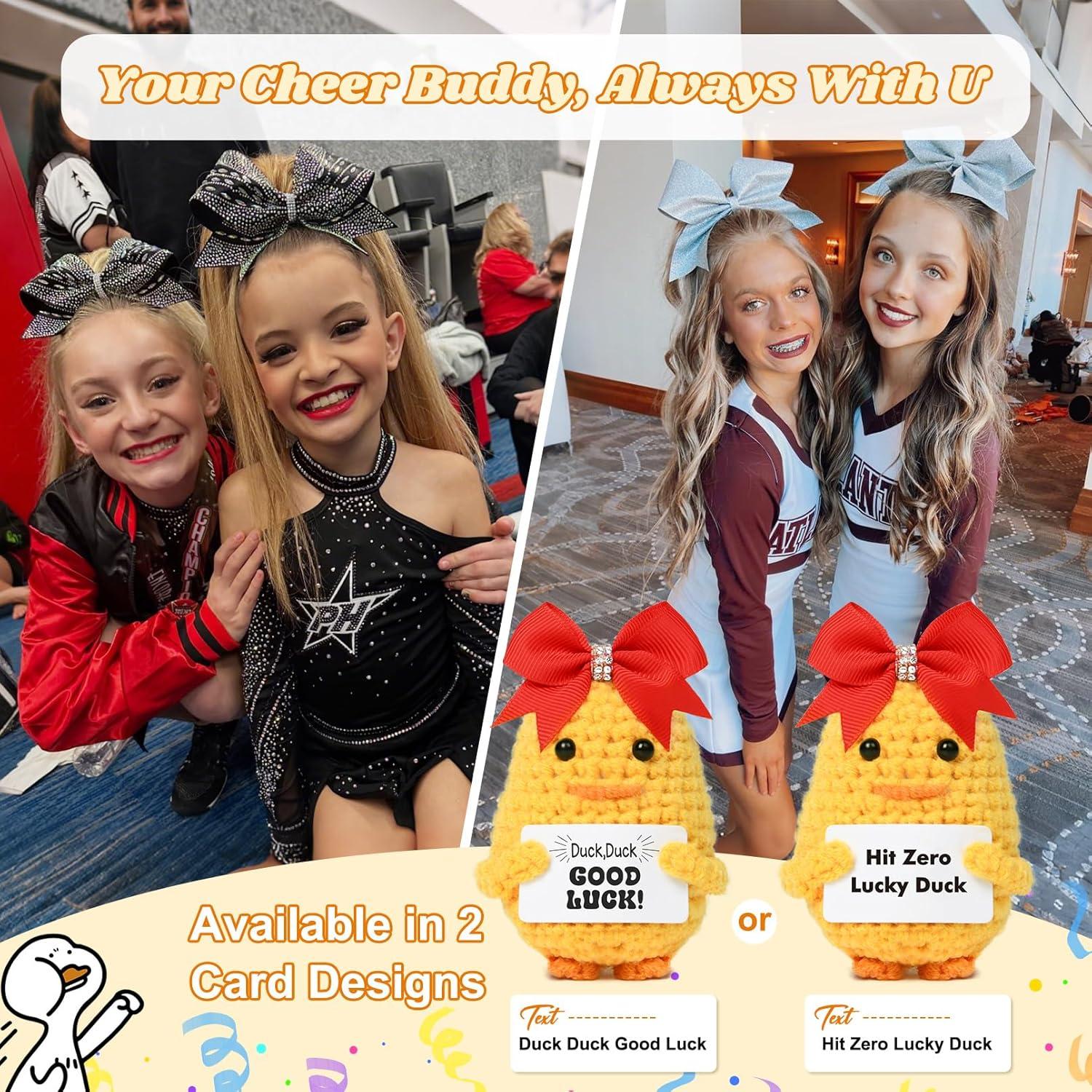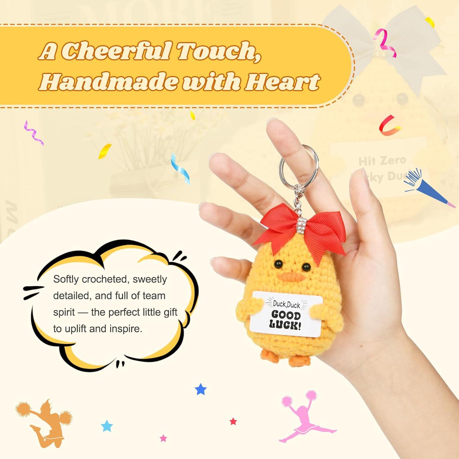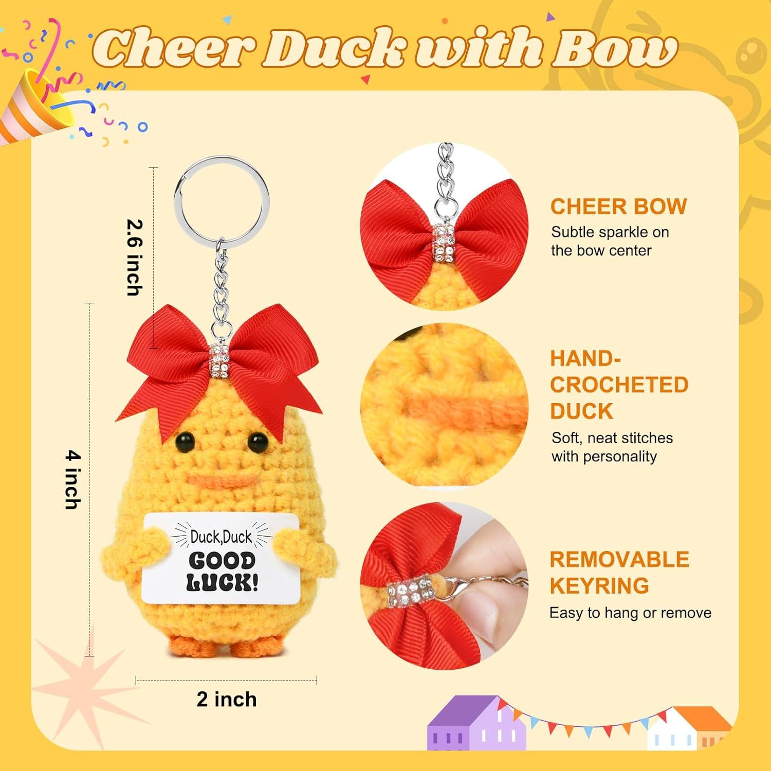 DEEKA Crochet Cheer Duck with Bow Cheer Gifts Bag Accessories Essentials Keychain for Backpack Cheerleading Team Gifts(Red Bow)