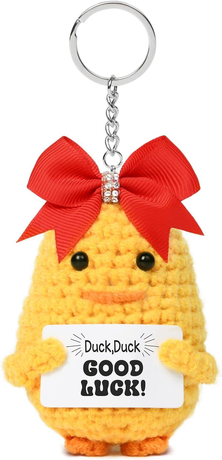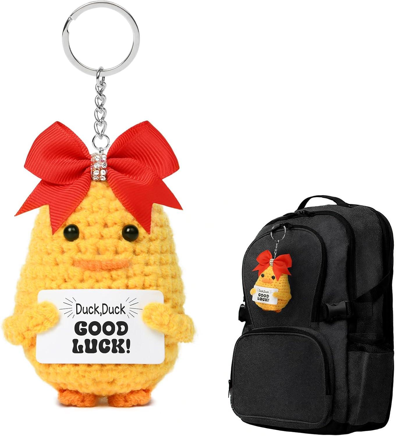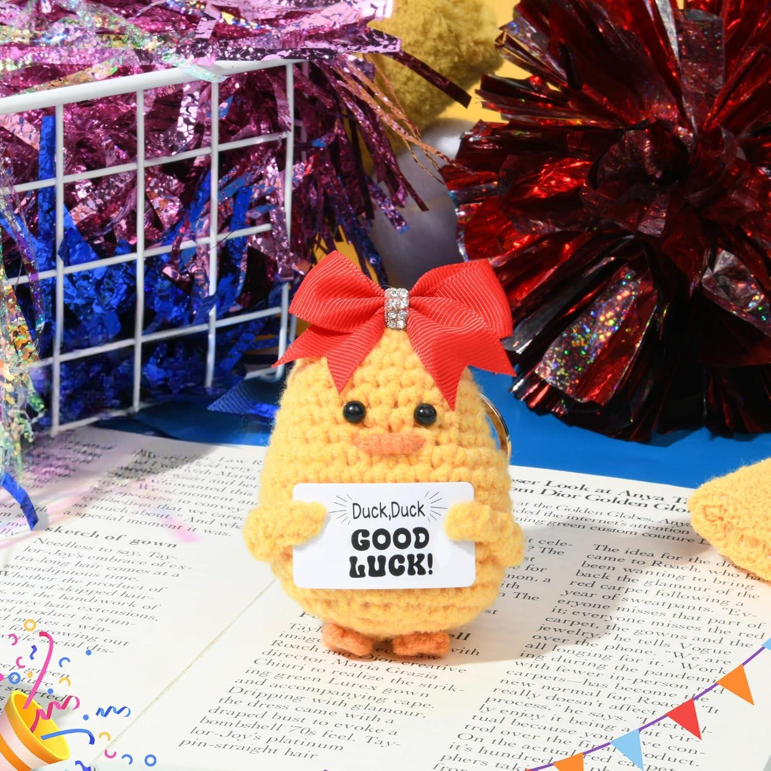 DEEKA Crochet Cheer Duck with Bow Cheer Gifts Bag Accessories Essentials Keychain for Backpack Cheerleading Team Gifts(Red Bow)