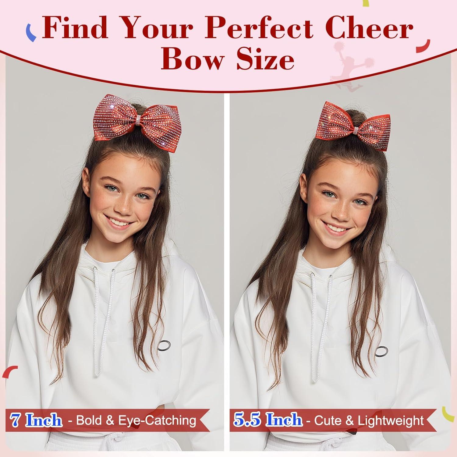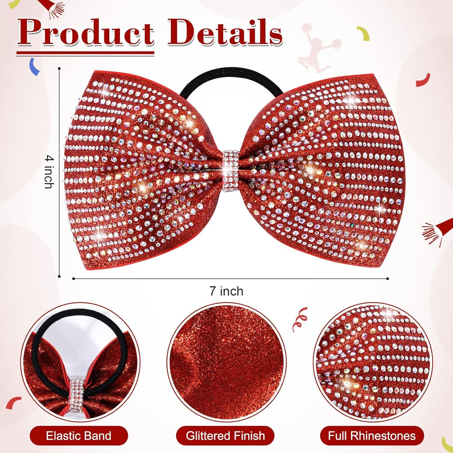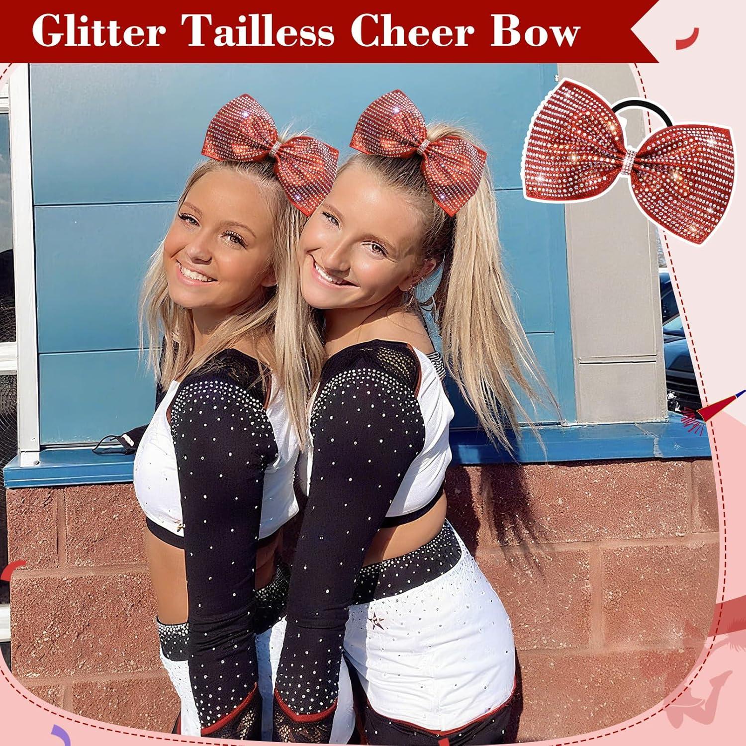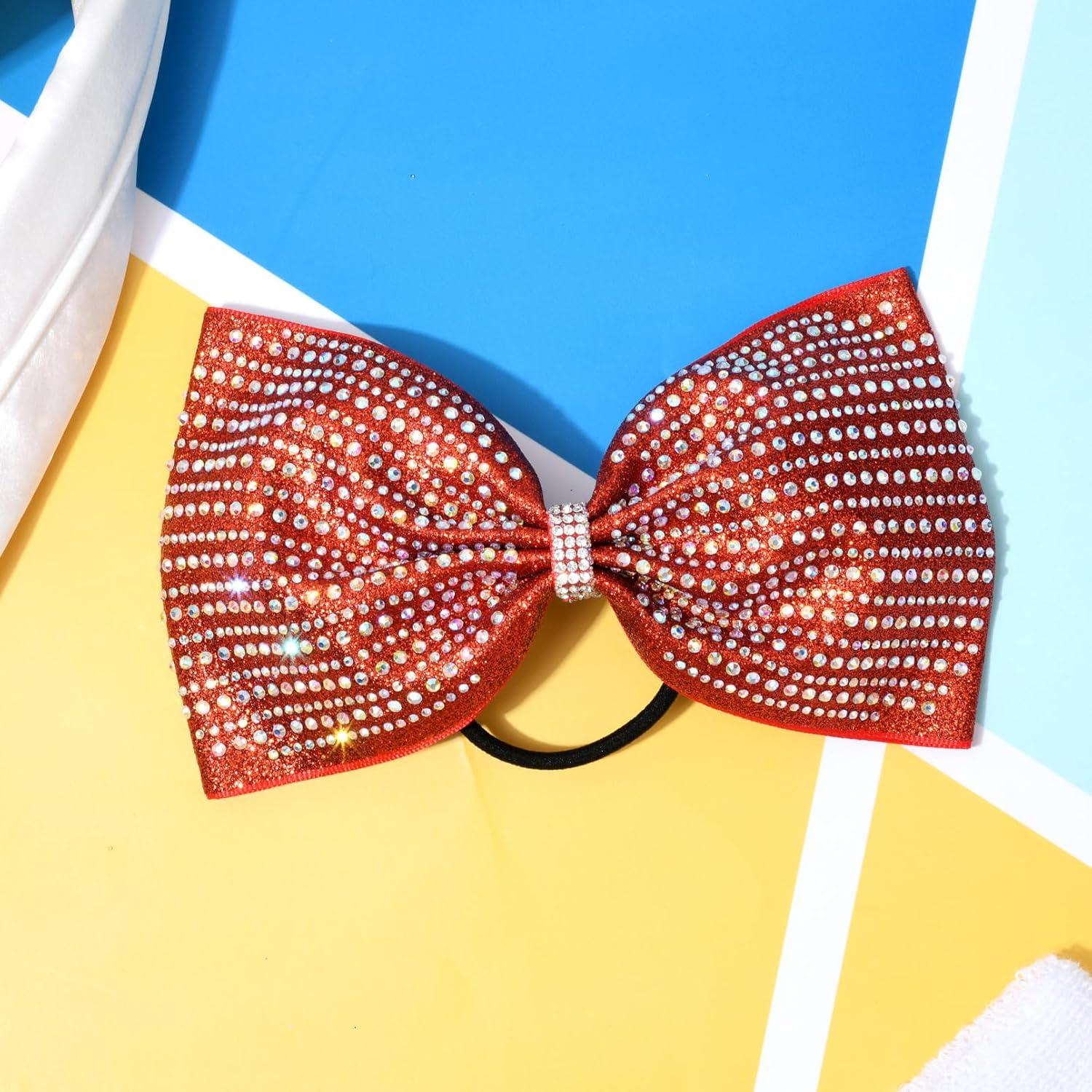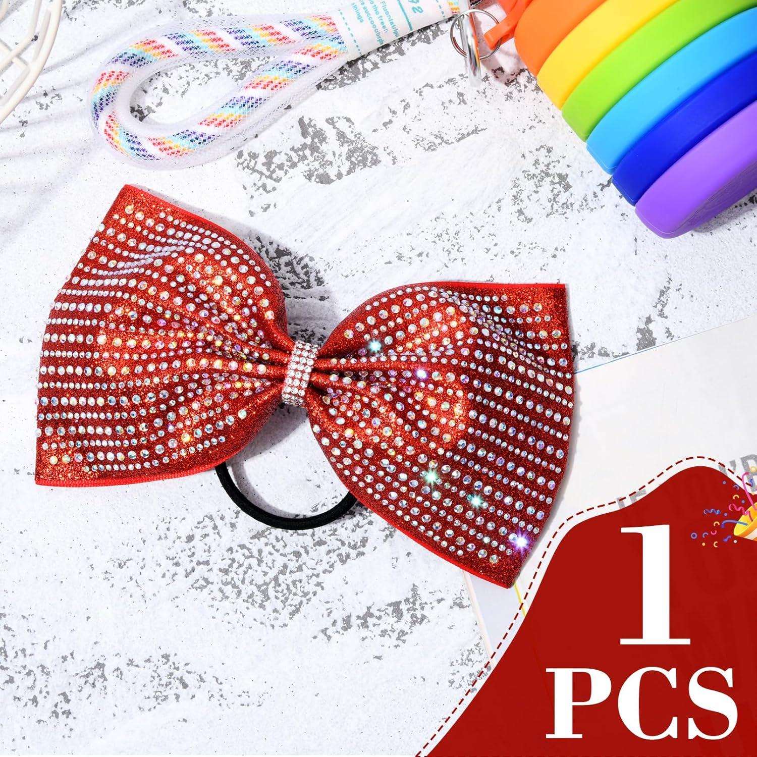 DEEKA Glitter Tailless Cheer Bows Rhinestones Competition Hair Bow Elastic Band for Cheerleading Cheerleaders Girls(Glitter Red(7 Inch))