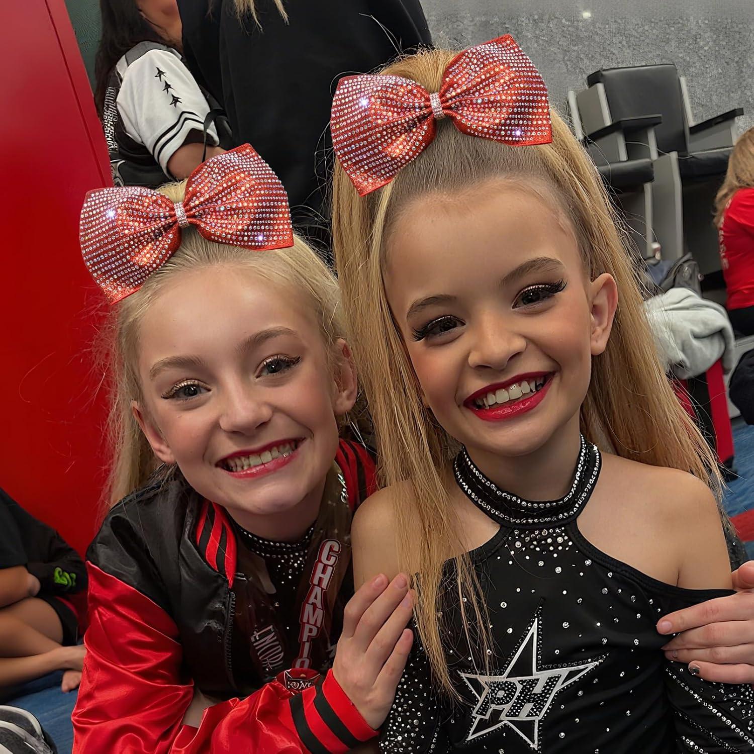 DEEKA Glitter Tailless Cheer Bows Rhinestones Competition Hair Bow Elastic Band for Cheerleading Cheerleaders Girls(Glitter Red(5.5 Inch))