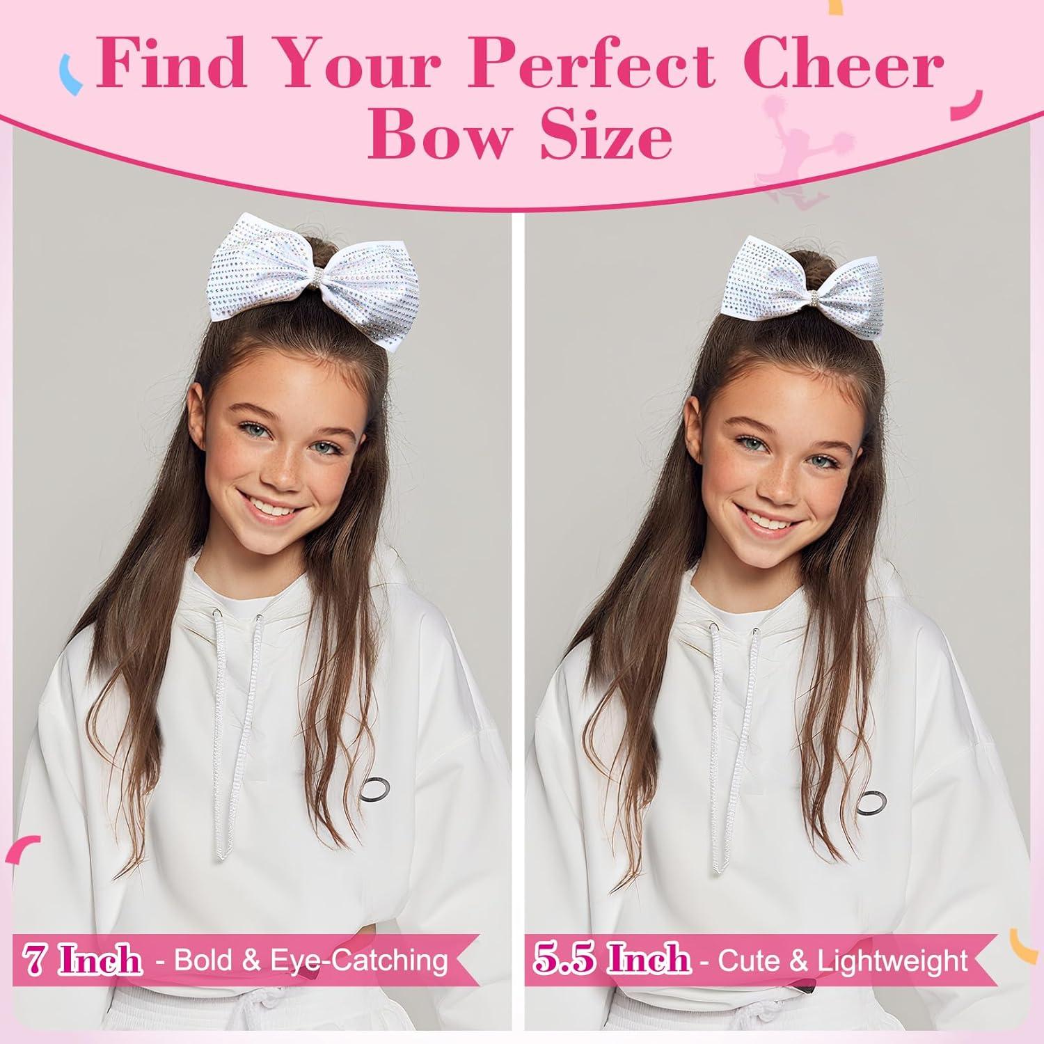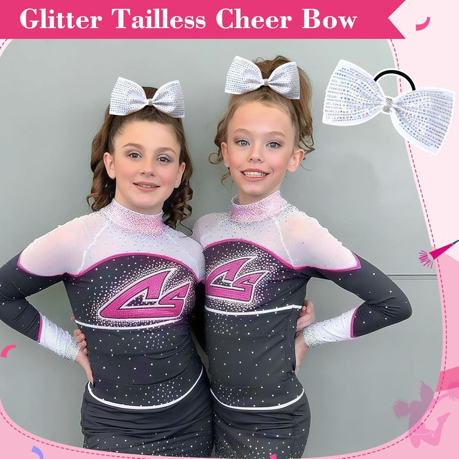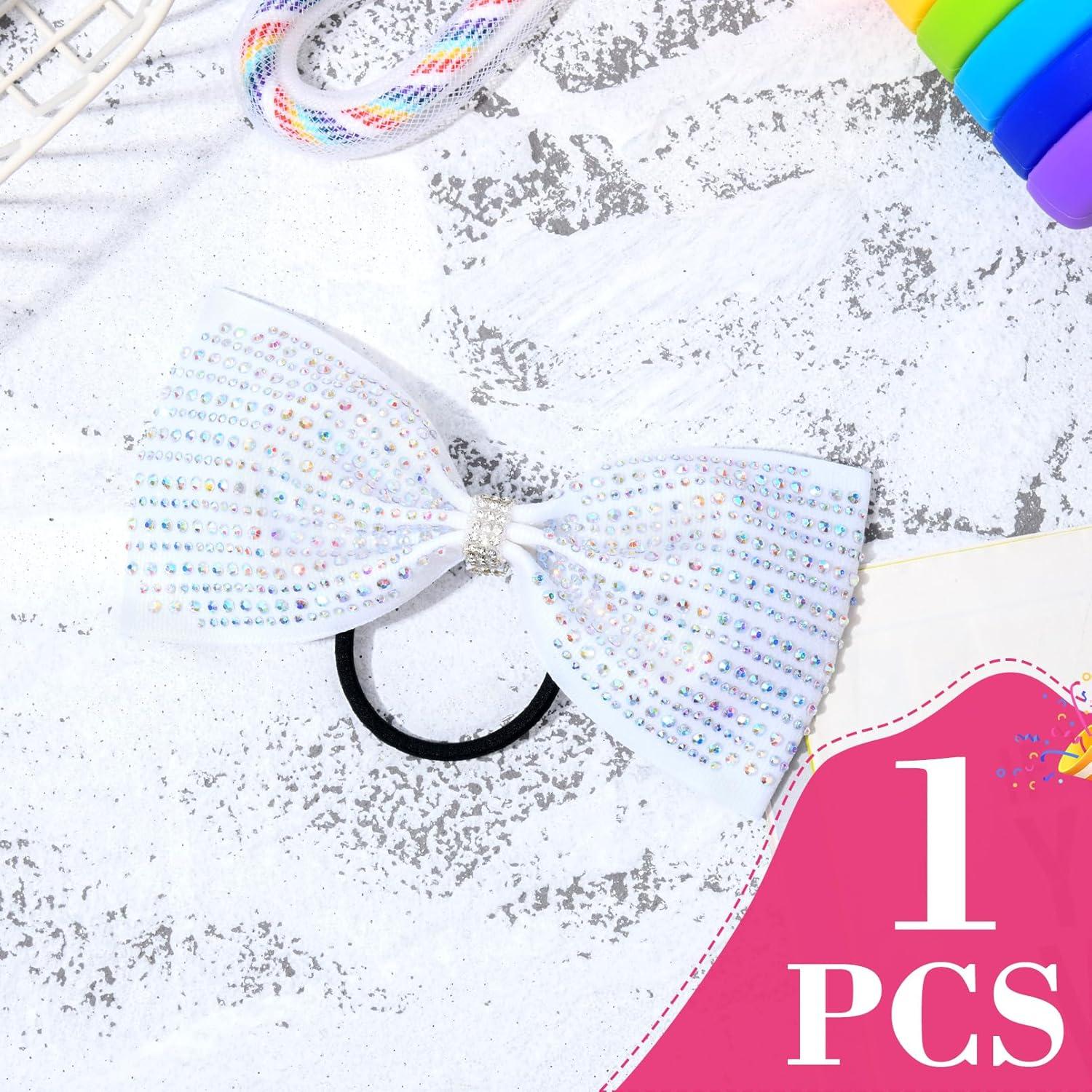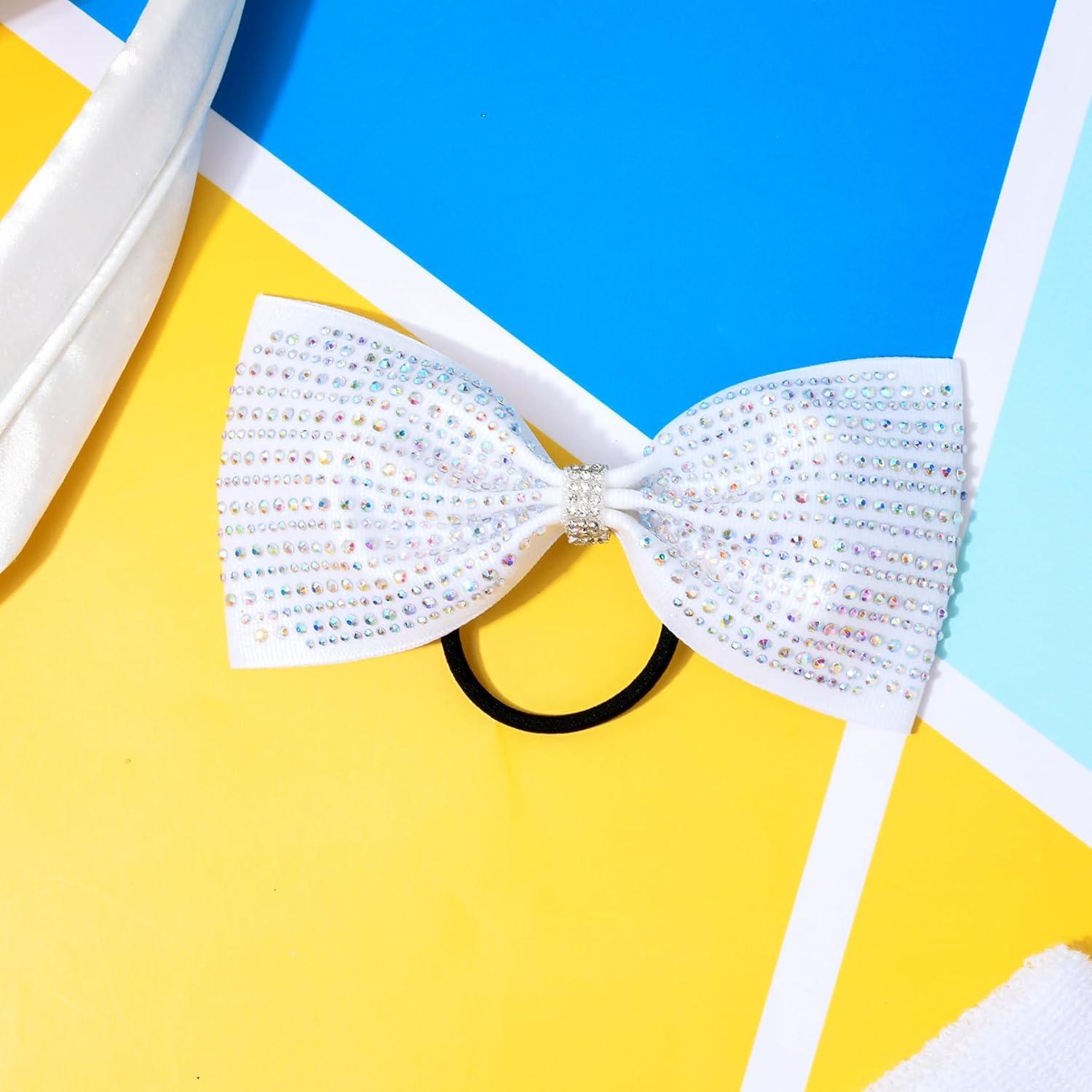 DEEKA Glitter Tailless Cheer Bows Rhinestones Competition Hair Bow Elastic Band for Cheerleading Cheerleaders Girls(Glitter White(7 Inch))