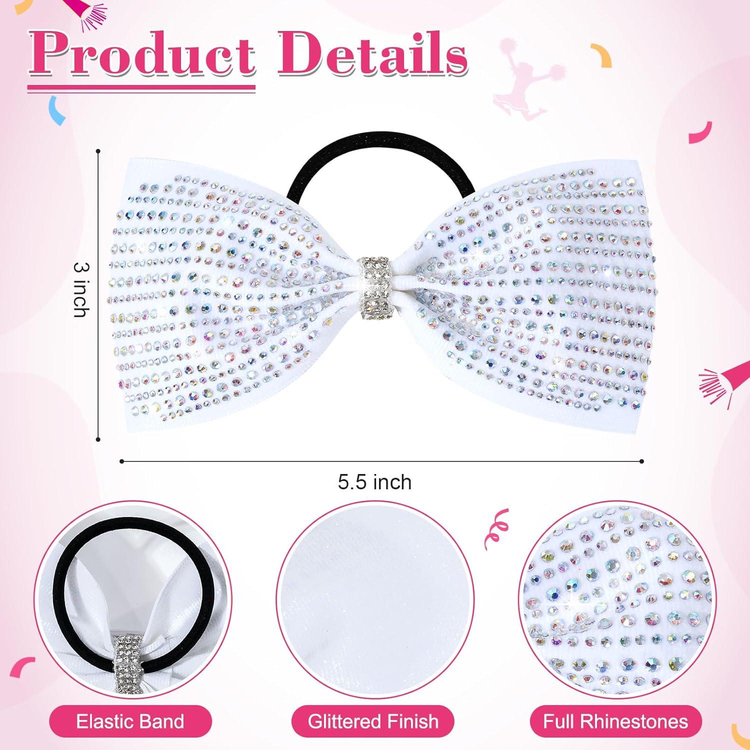 DEEKA Glitter Tailless Cheer Bows Rhinestones Competition Hair Bow Elastic Band for Cheerleading Cheerleaders Girls(Glitter White(5.5 Inch))