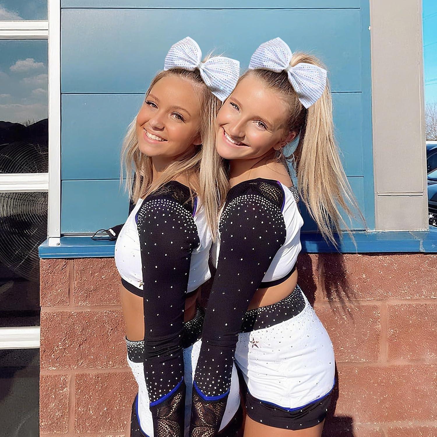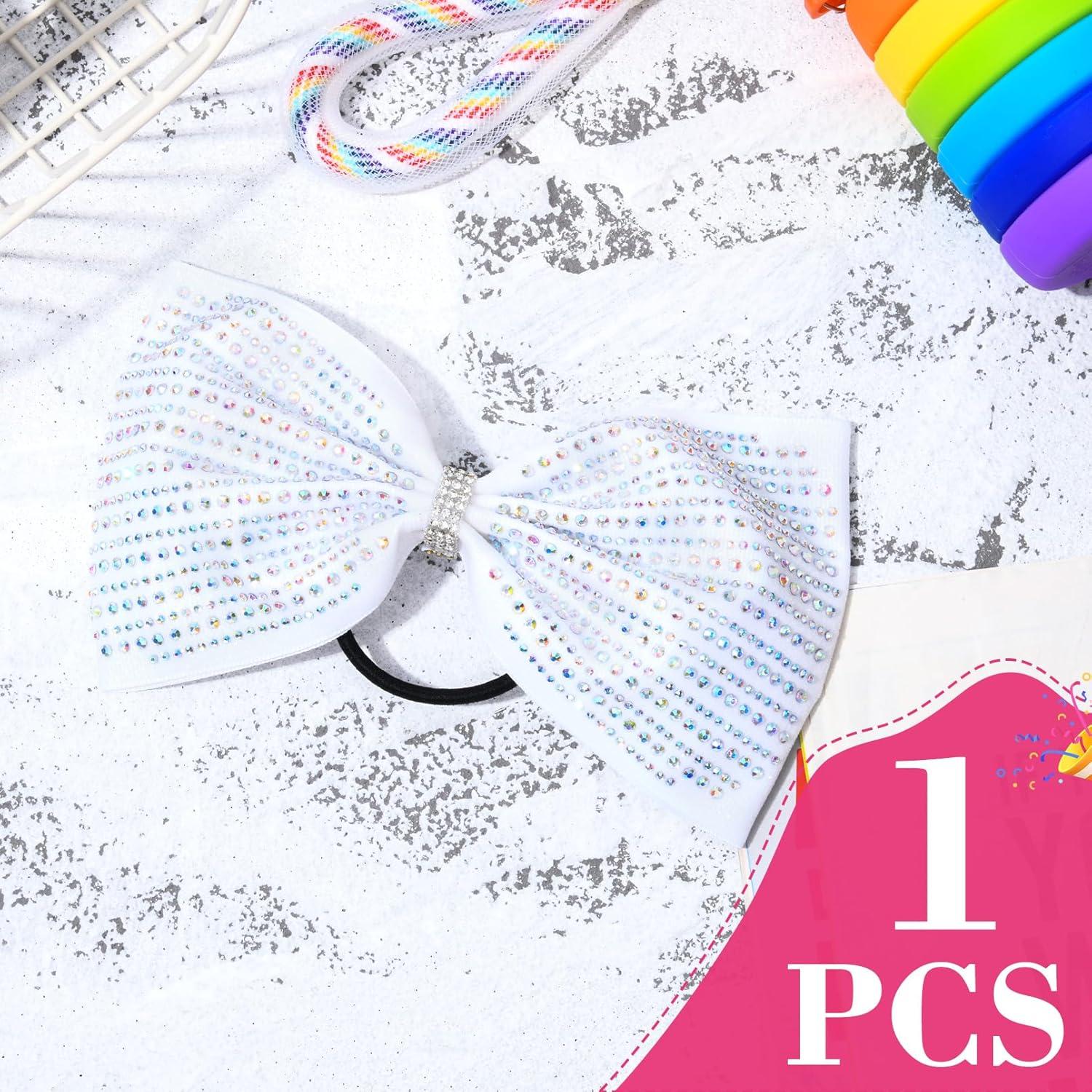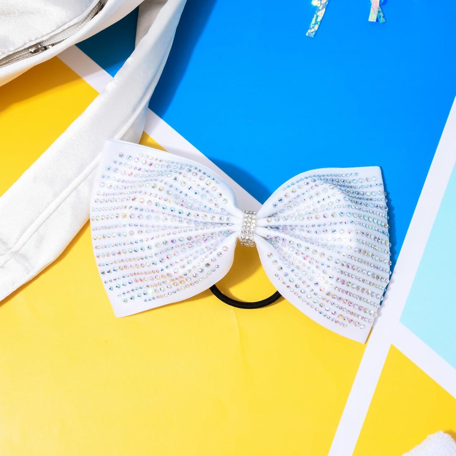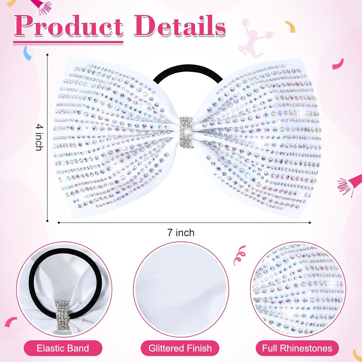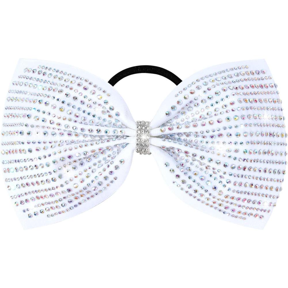 DEEKA Glitter Tailless Cheer Bows Rhinestones Competition Hair Bow Elastic Band for Cheerleading Cheerleaders Girls(Glitter White(7 Inch))